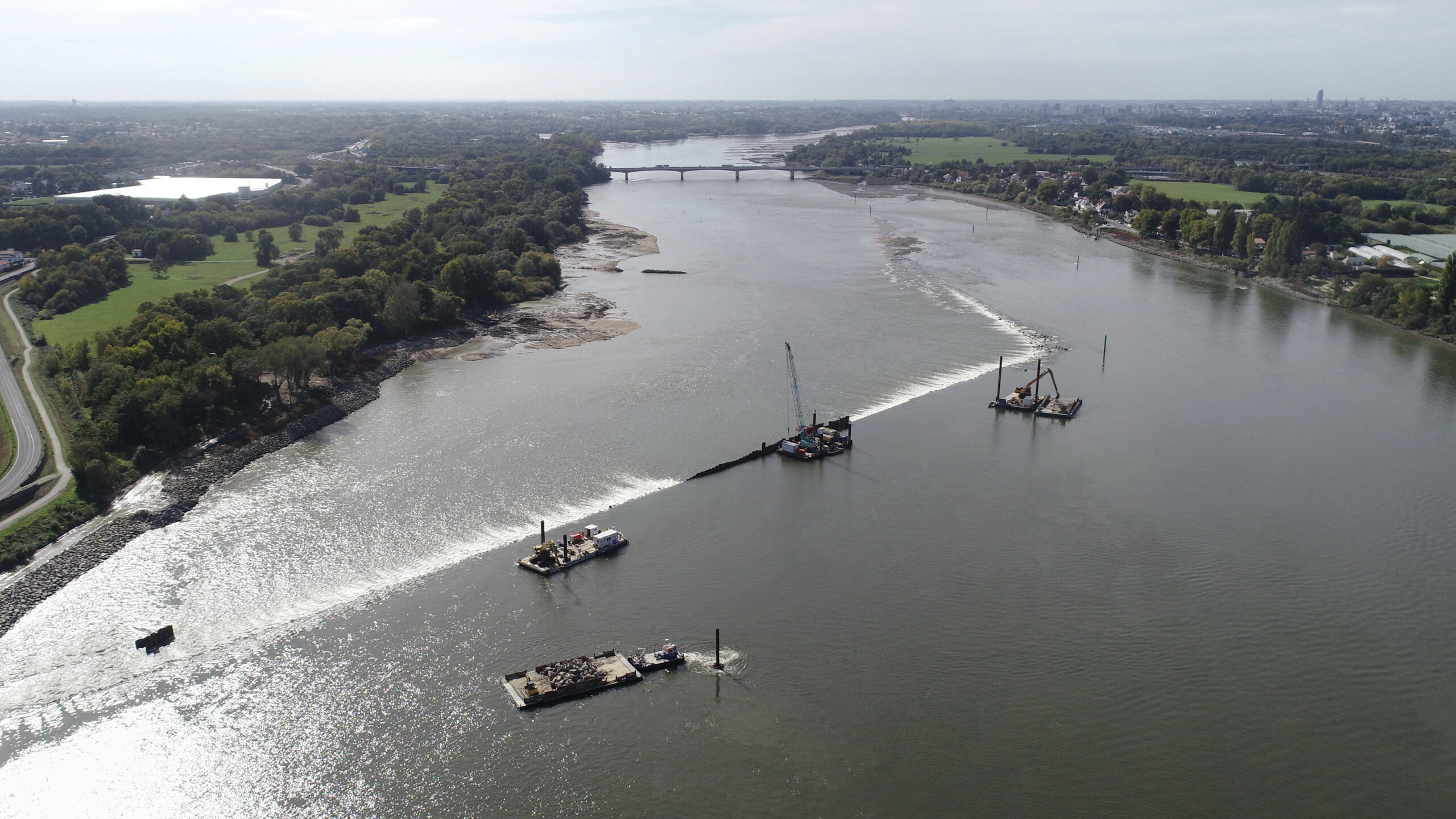 Le rétablissement du seuil de Bellevue en novembre 2025 en voie d’achèvement : la longue digue submersible (appelée duit) contraint le courant principal à se diriger vers la rive droite, en bordure du village du même nom, en passant de nouveau sur l’affleurement rocheux naturel contorné en 1975. La calibration très étudiée de l’ouvrage permettra de relever le niveau des étiages de 1,80 m aux périodes de basses mers, sans aggraver les risques d’inondation…