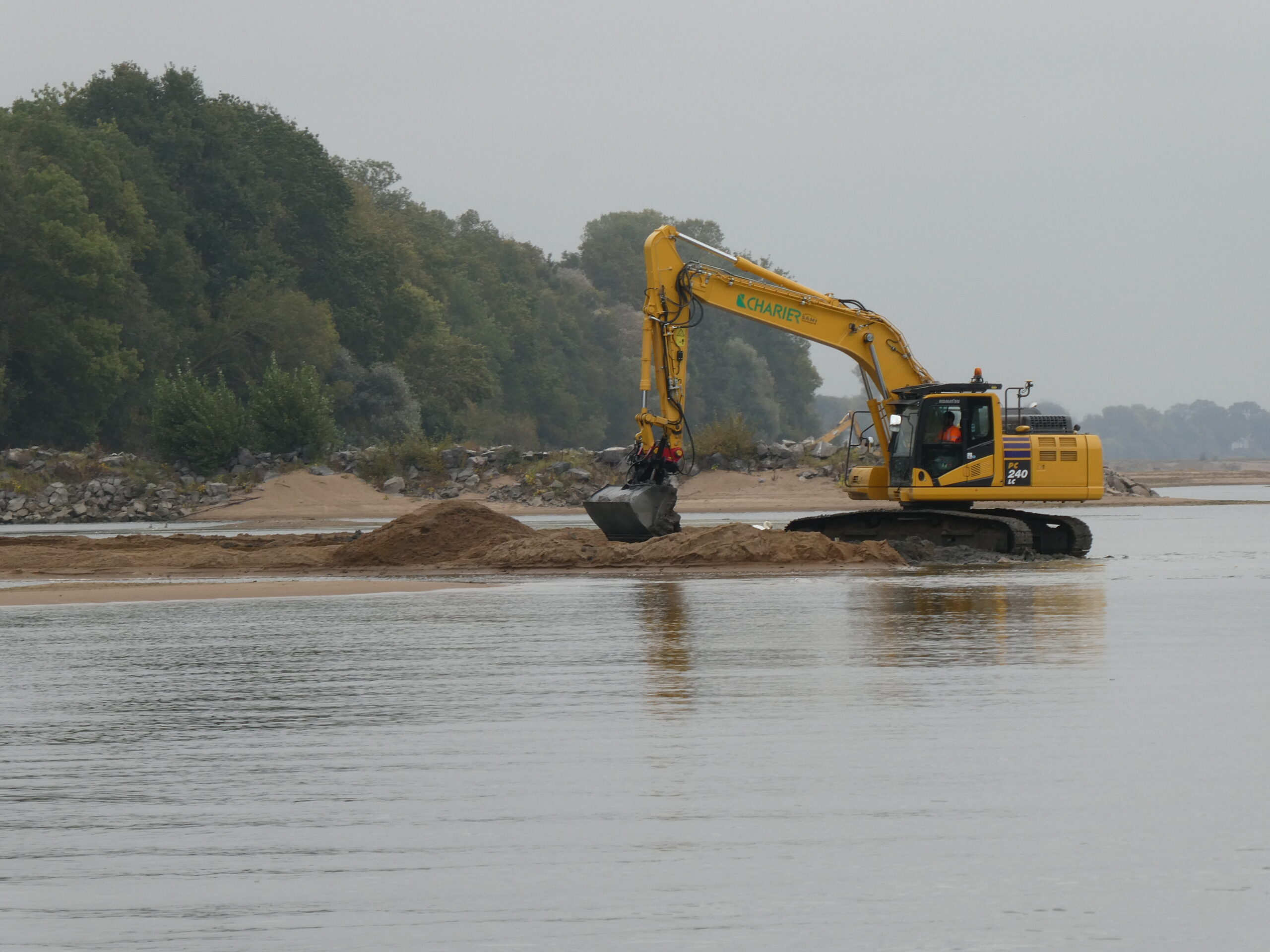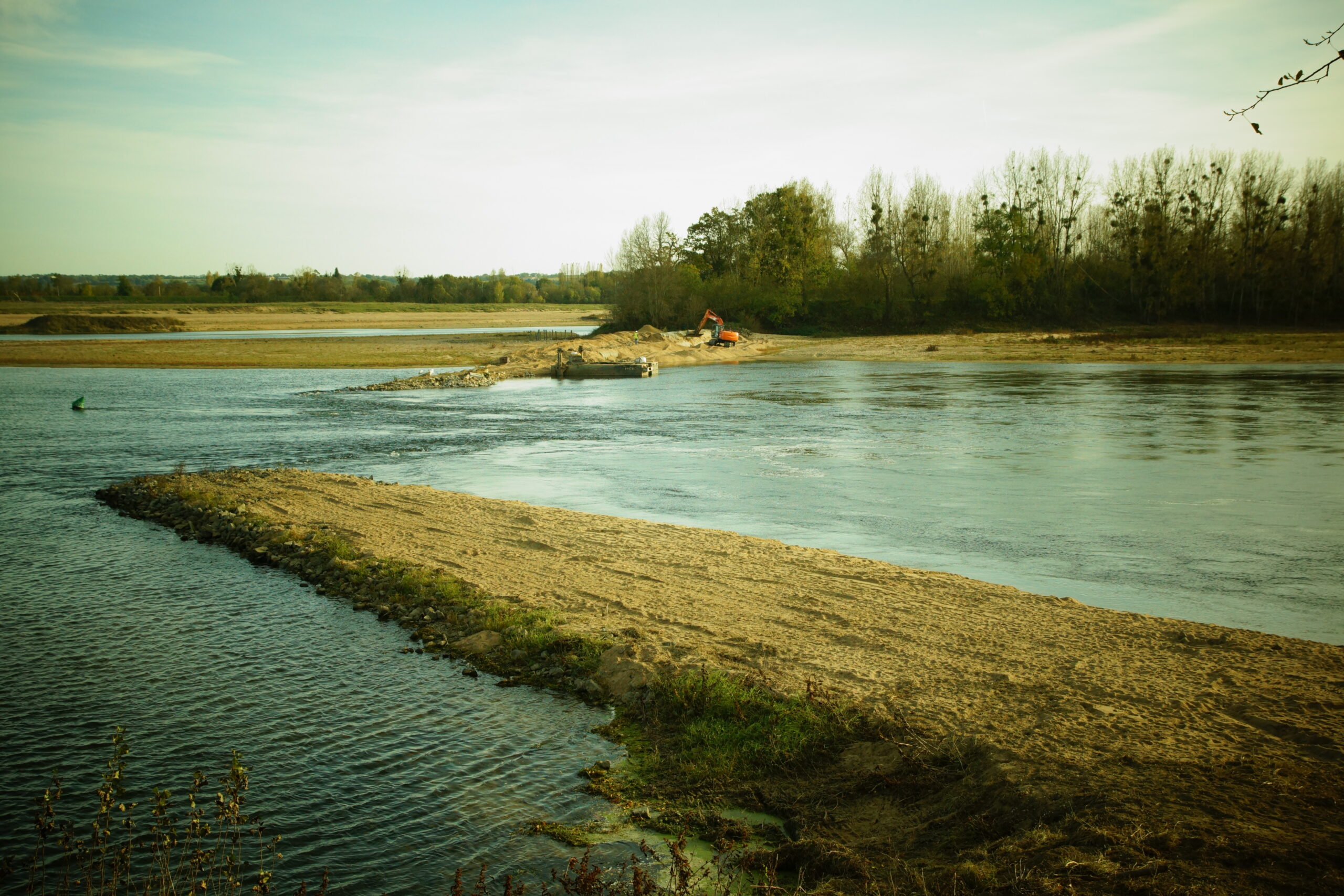 Suppression d’un épi en amont d’Ancenis en 2024 (CLD). En arrière-plan, un épi non remodelé surplombant de 3 m la surface des eaux…